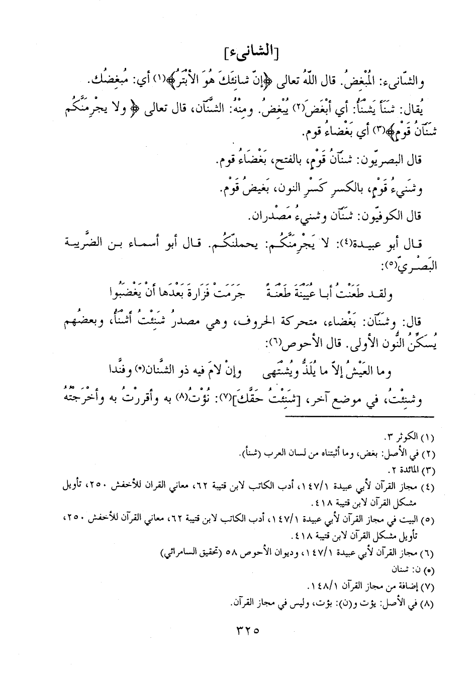 قال: وشنَآن: بَغْضاء، متحركة الحروف، وهي مصدرُ شَنِئْتُ أشْنَأُ، وبعضُهم يُسكِّنُ النُّون الأولى. قال الأحوص: