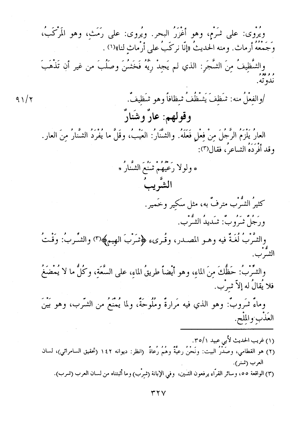 العارُ يَلْزَمُ الرجُلَ مِنْ فِعْلِ فَعَلَهُ. والشَّنَارُ: العَيْبُ، وقَلَّ ما يُفْرَدُ الشَّنارُ من العار. وقد أفرَدَهُ الشاعر، فقال: