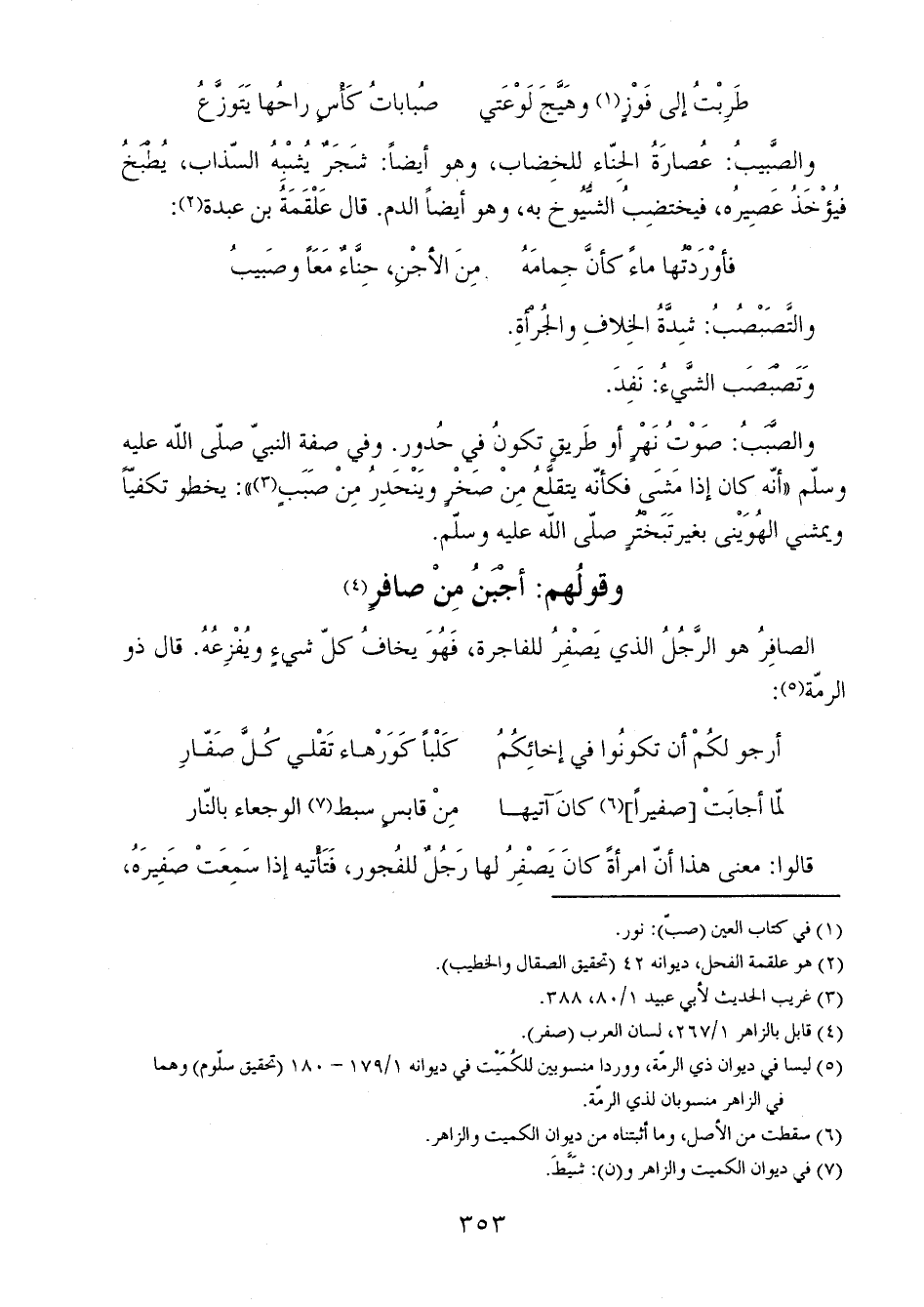 والصُّفْرُ: الشَّيءُ الخالي، تقولُ: صَفِرَ الإناءُ صُفُوراً وصَفَراً، وهو صِفْرٌ، والجميعُ والواحدُ والذَّكَرُ والأنثى فيه سواء. ويُقالُ للرَّجُلِ إذا هَلَكَ: صَفِرَتْ وطابُهُ، لأنَّهُ إذا مات فرغت نَفْسُه. قال امرؤ القيس: