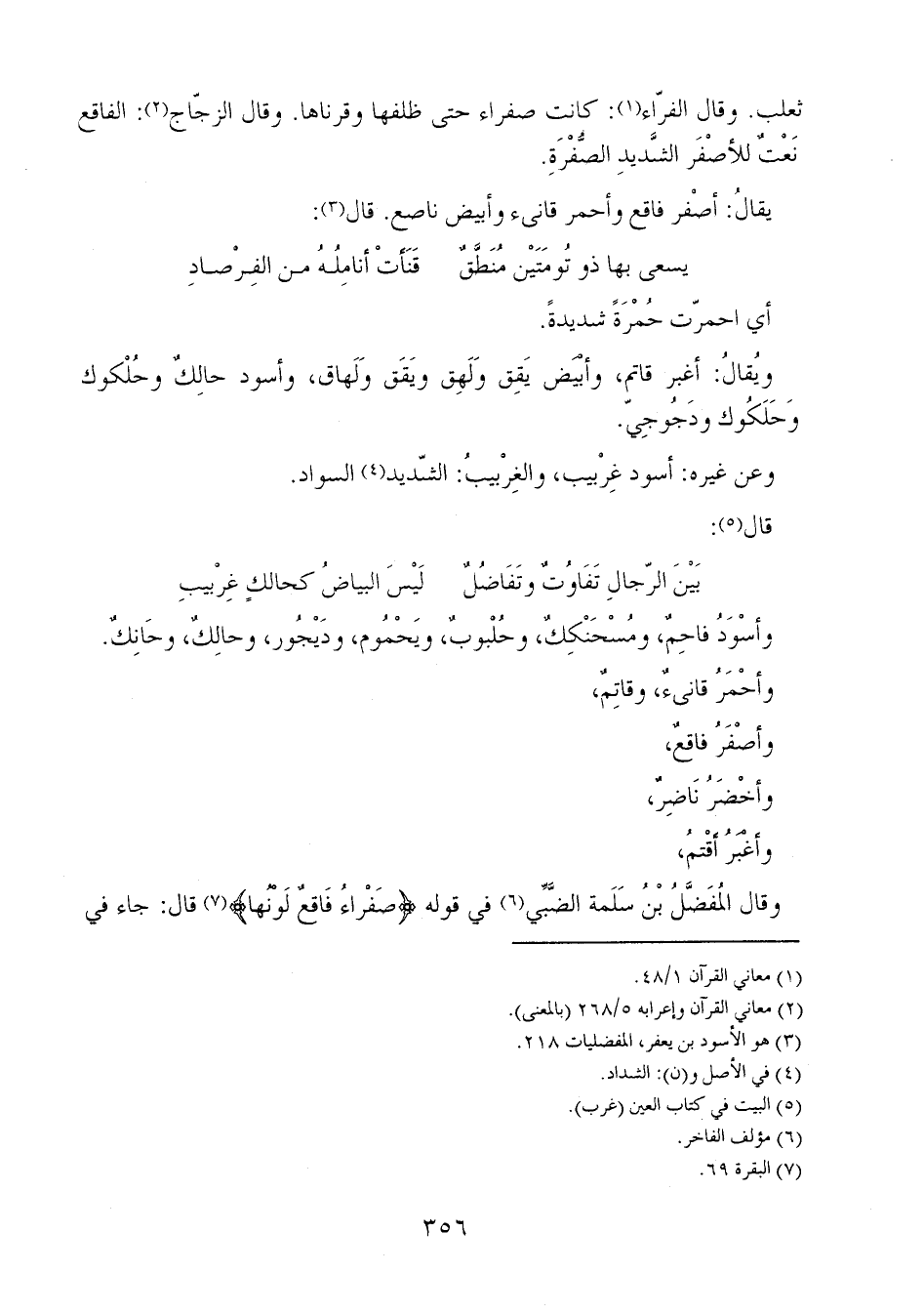 قال ابن قتيبة في صفراء بِقَوْلِ المُفَضَّلِ، قال: وقَوْلُ من قال سوداء غَلِطَ في نُعوت البقر. قال: وإنما يكونُ ذلك في نُعوت الإبل: يُقال: بعيرٌ أصْفَر، أي أسود، لأنّ السُّودَ من الإبل يشوب سوادها بصُفْرةٍ، والعرب لا تقول أسودُ فاقع، فيما أعلم، إنما هو أسْوَدُ حالك وأحمرُ قانيء وأصفرُ فاقع وأبيضُ يقَق وأخَضَرُ ناضِر.