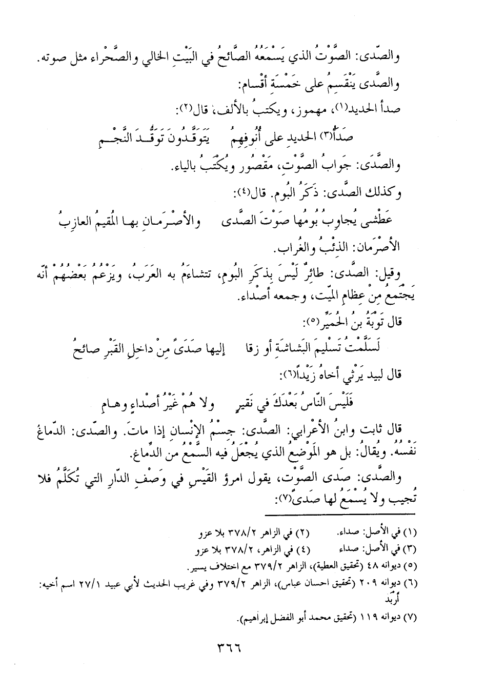 والصَّدى: طائرٌ يَزْعُمُ العَرَبُ أنّ الرَّجُلَ إذا ماتَ خرجَ من رأسهِ، واسمه الصَّدى، فيصيحُ عليه: وافُلاناه، فقال النبي صلى الله عليه [وسلم]: "لا صَدَى ولا هامة" أي أنّ ذلك كَذِبٌ وباطِلٌ.