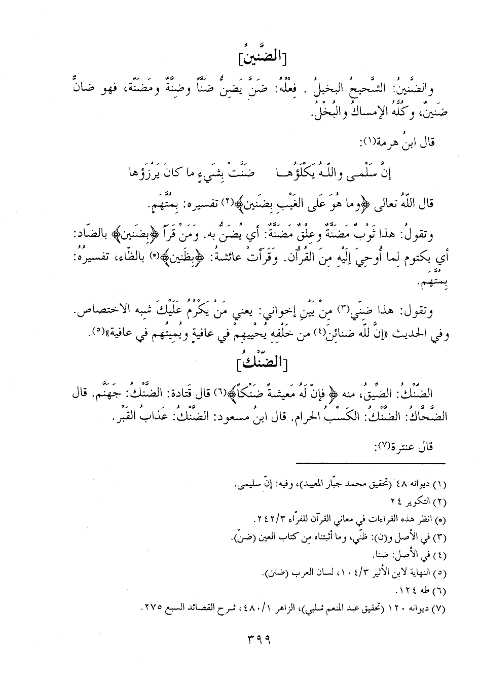 وتقولُ: هذا ثَوْبٌ مَضَنَّةٌ وعِلْقٌ مَضَنَّةٌ: أي يُضَنُّ به. ومَنْ قرأ {بِضَنِينٍ} بالضاد: أي بكتوم لِما أُوحِيَ إلَيْهِ مِنَ القُرْآن. وقَرَأَتْ عائشة {بِظَنين} بالظّاء: تفسيرُهُ: بمُتَّهَم.