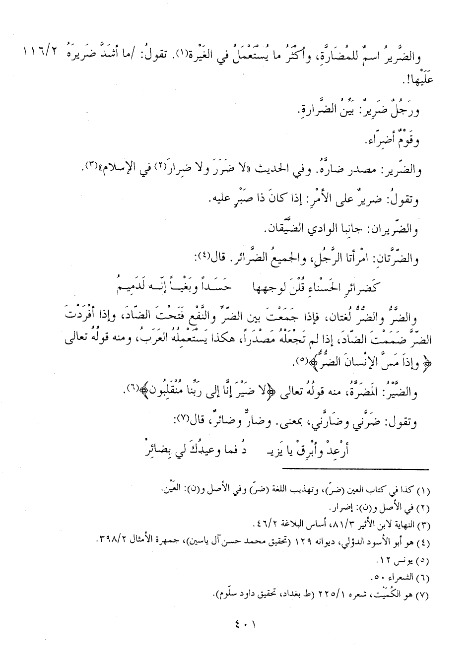 والضَّرُّ والضُّرُّ لُغتان، فإذا جَمَعْتَ بين الضّرِّ والنَّفْع فتَحْتَ الضّادَ، وإذا أفْرَدْتَ الضّرَّ ضَمَمْتَ الضّادَ، إذا لم تَجْعَلْهُ مَصْدَراً، هكذا يَسْتَعْمِلُهُ العَرَبُ، ومنه قولُهُ تعالى {وَإِذَا مَسَّ الإِنْسَانَ الضُّرُّ}.