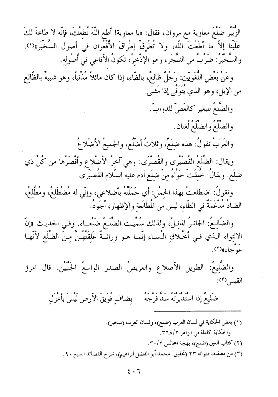 والعَرَبُ تقولُ: هذه ضِلَعٌ، وثلاثُ أضْلُع، والجميعُ الأضْلاعُ.