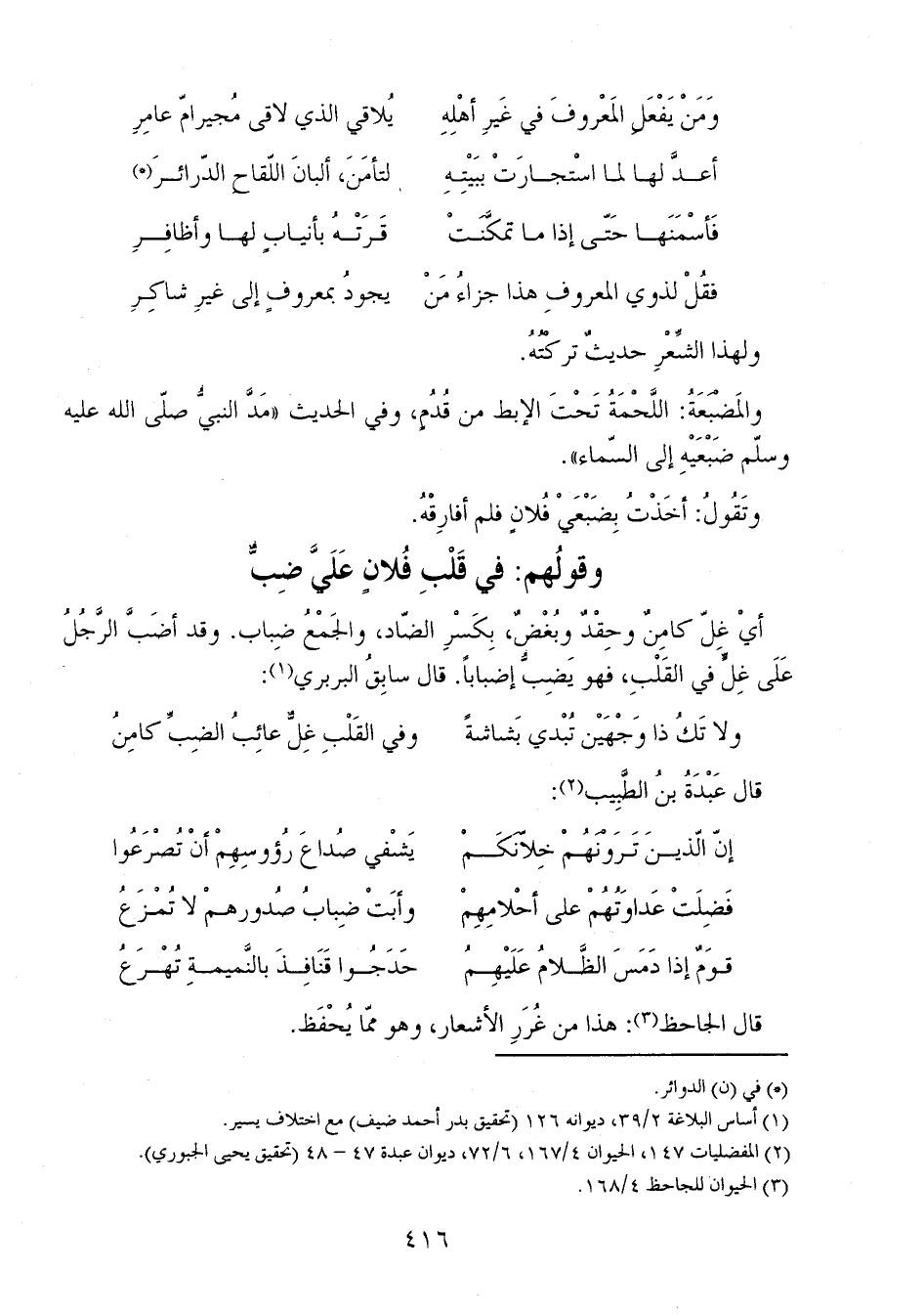 ولا تَكُ ذا وجْهَيْن تُبْدي بَشاشةً ... وفي القَلْبِ غِلٌّ عائِبُ الضِبِّ كامِنُ