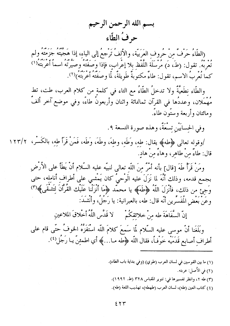 (الطّاءُ حَرْفٌ منْ حُروفِ العَرَبيّة، والألِفُ تَرْجعُ إلى الياء، إذا هَجَّيْتَهُ جَزَمْتَهُ ولم تُعْرِبْهُ. تقول: (طَ، دَ) مُرْسَلةَ اللَّفْظِ بلا إعْرابٍ، فإذا وَصَفْتَهُ وصَيَّرْتَهُ اسماً أعْرَبْتَهُ كما تُعْرِبُ الاسمن تقول: طاءٌ مكتوبةٌ طويلةٌ، لمّا وصَفْتَهُ أعْرَبْتَهُ).