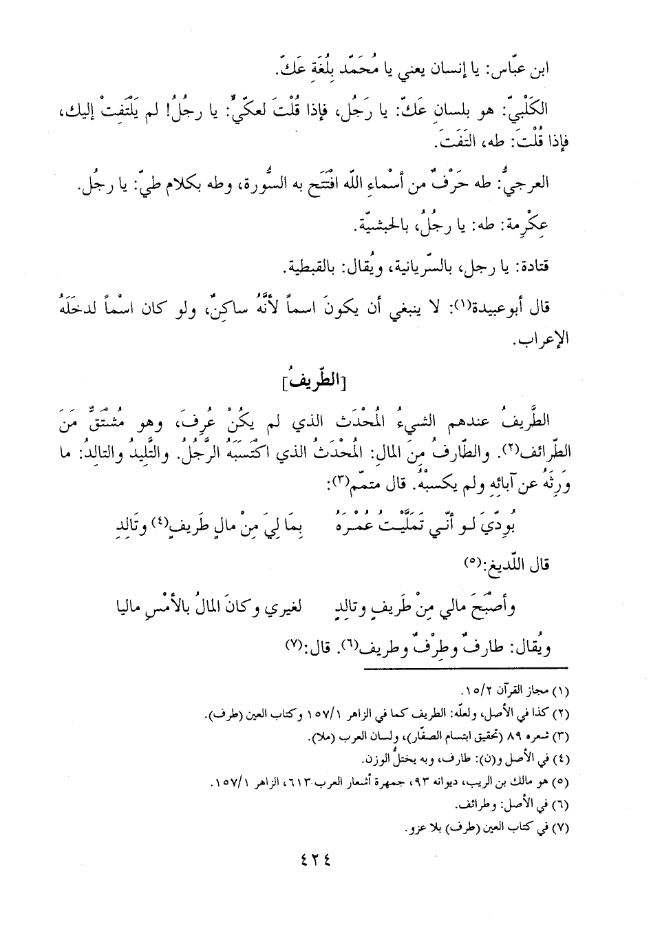 الطَّريفُ عندهم الشيءُ المُحْدُث الذي لم يكُنْ عُرِفَ، وهو مُشْتَقٍّ مَنَ الطرائف. والطّارفُ من المالِ: المُحْدَثُ الذي اكْتَسَبَهُ الرَّجُلُ. والتَّلِيدُ والتالِدُ: ما وَرِثَهُ عن آبائِهِ ولم يكسْبُه. قال متمم: