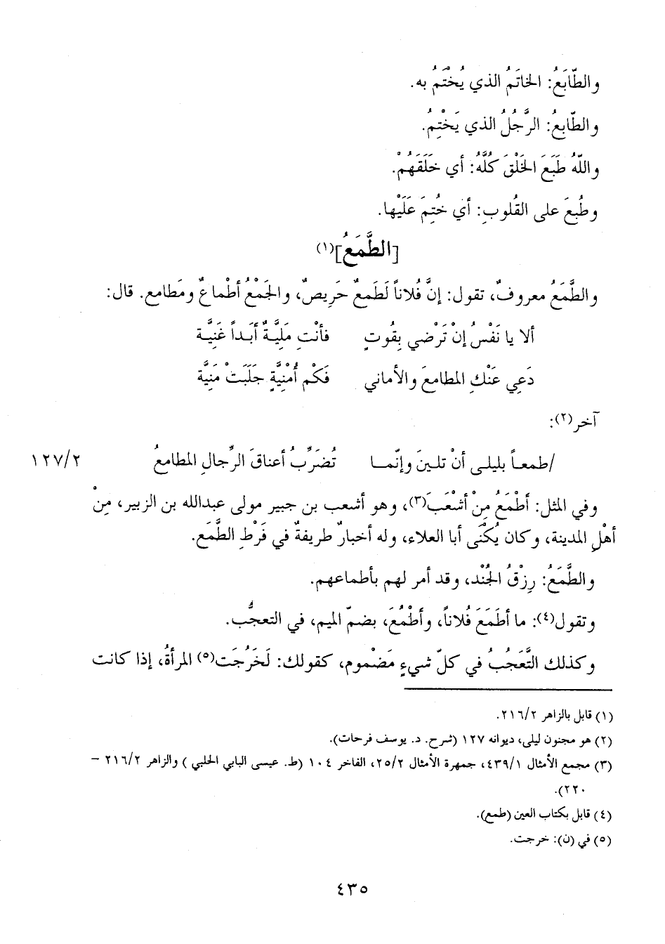 2/ 127 طمعاً بليلي أن تلينَ وإنما ... تُضربُ أعناقَ الرجالِ المطامعُ