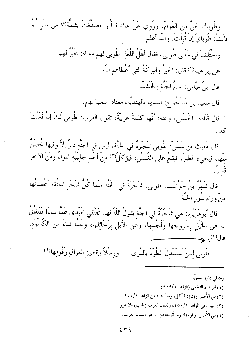 قال مُغيثُ بن سُمَيّ: طُوبى شجرةٌ في الجَنَّة، ليس في الجنَّةِ دارٌ إلا وفيها غُصْنٌ منها، فيجيء الطيرُ، فيقعُ على الغُصنِ، فيؤكَلُ منْ أحدِ جانبيهِ شواءٌ ومنَ الآخر قديرٌ.