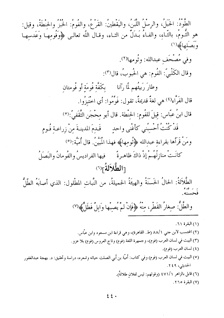 الطَّوْدُ: الجَبَلُ، والرِسْلُ اللَّبَنُ، واليَقْطينُ: القَرْعُ، والفُومُ: الخُبْزُ والحِنْطَةُ، وقيل: هو الثُّومُ، بالثاءِ، والفاءُ بدلٌ من الثاء، وقال الله تعالى {وَفُومِهَا وَعَدَسِهَا وَبَصَلِهَا}.