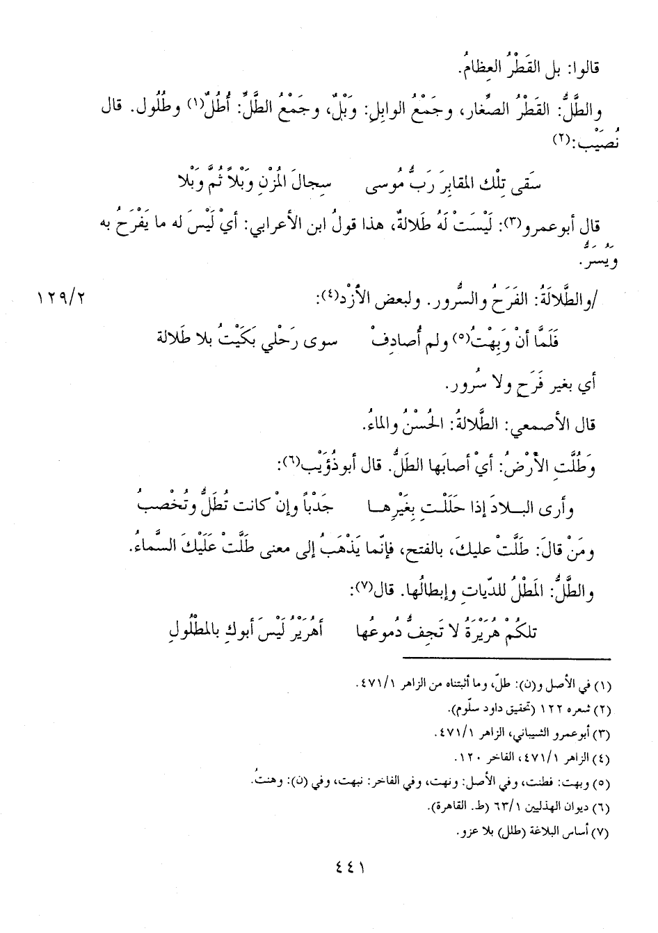 2/ 129 والطلالةُ: الفَرَحُ والسرور. ولبعض الأزد: