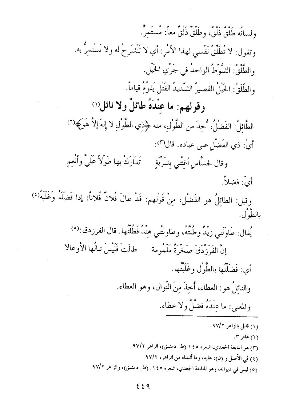 وقولهم: ما عِنْدَهُ طائلٌ ولا نائل