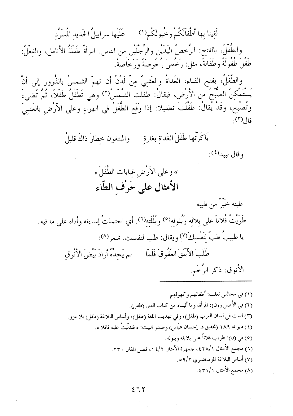 والطَّفَلُ، بفتح الفاء، الغداةُ والعَشِيّ مِنْ لَدُنْ أن تهمّ الشمسُ بالذُّورِ إلى أنْ يَسْتَمْكِنَ الصُّبْحُ من الأرْض، فيقالُ: طفلت الشَّمْسُ وهي تطْفُلُ طَفْلاً، ثُمَّ تُضيءُ وتُصْبح، وقَدْ يُقالُ: طَفَّلَتُ تطفيلا: إذا وَقَع الطَّفَلُ في الهواءِ وعلى الأرْضِ بالعَشِيّ قال: