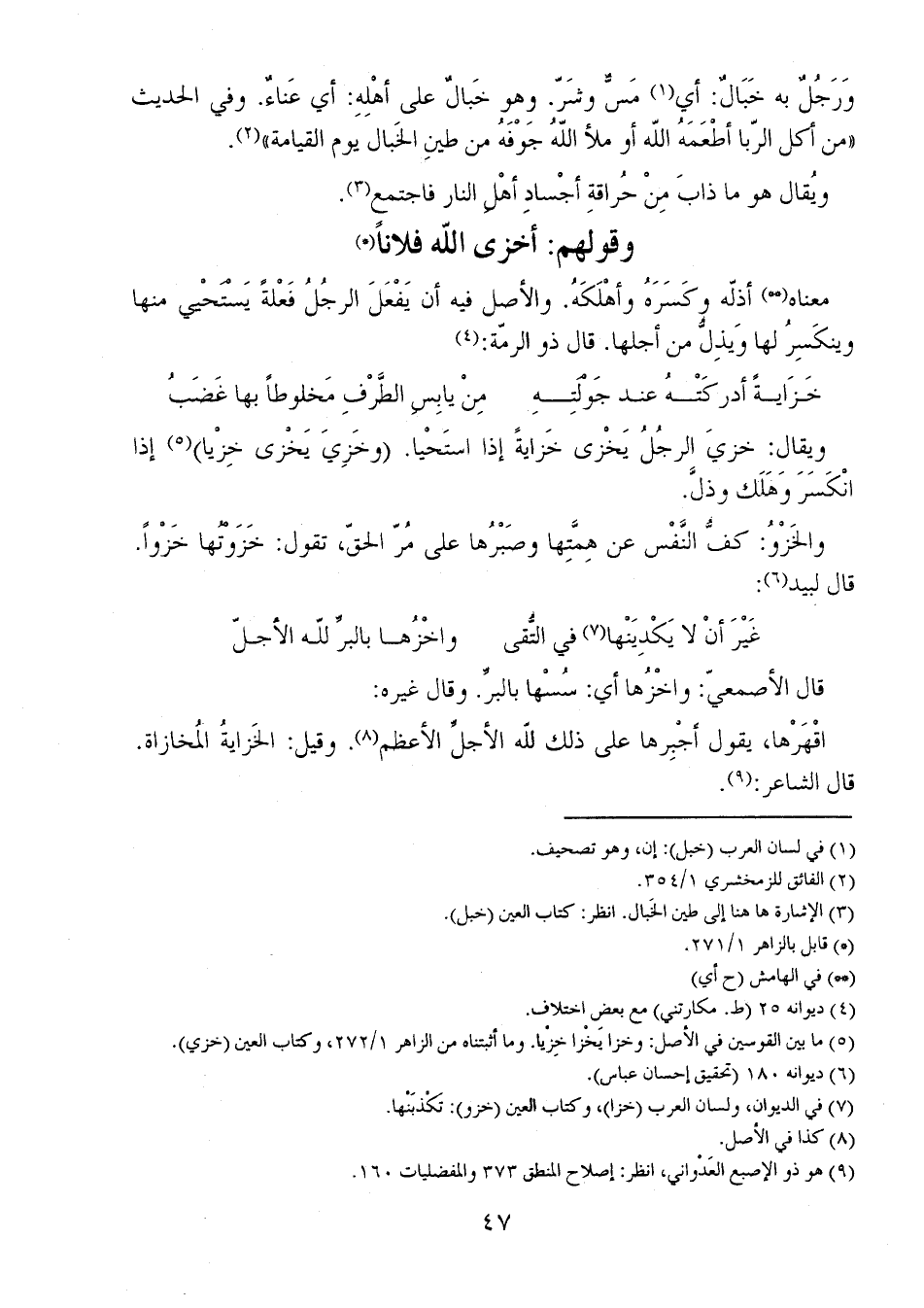والخزوُ: كفُّ النفس عن همتها وصبرها على مر الحق، تقول: خزوتها خزواً. قال لبيد: