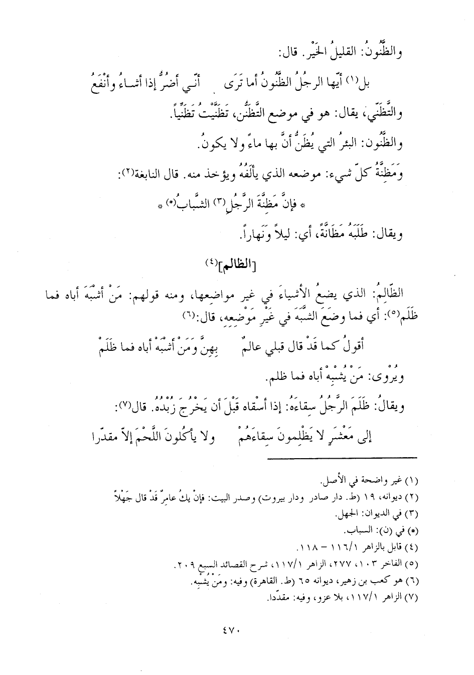 الظّالِمُ: الذي يضعُ الأشياءَ في غير مواضِعها، ومنه قولهم: مَنْ أشْبَهَ أباه فما ظَلَم: أي فما وضعَ الشَّبَهَ في غَيْرِ مَوْضعِهِ، قال: