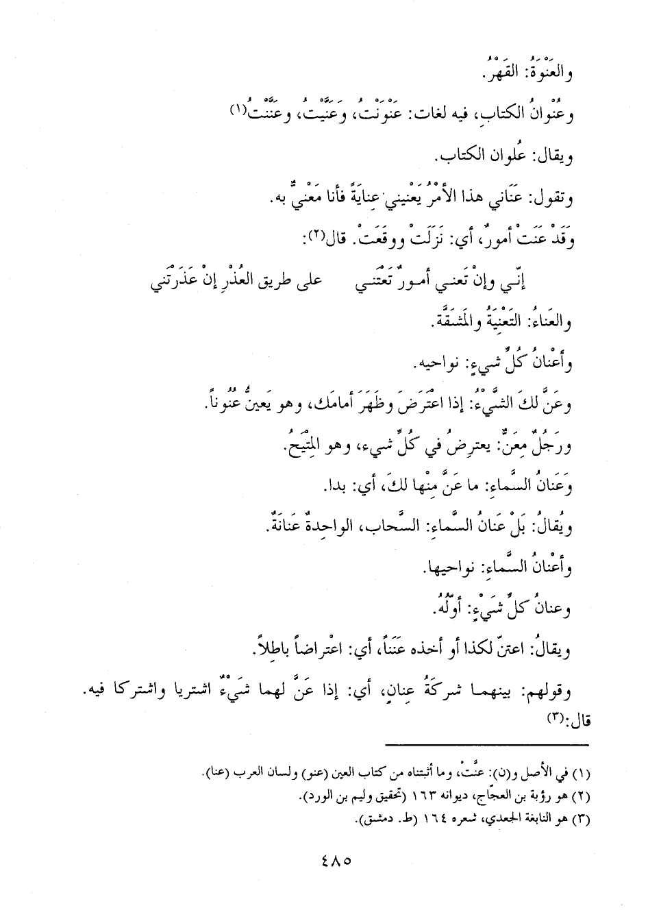 وعُنْوانُ الكتابِ، فيه لغات: عَنْوَنْتُ، وعَنَّيْتُ، وعَنَّنْتُ