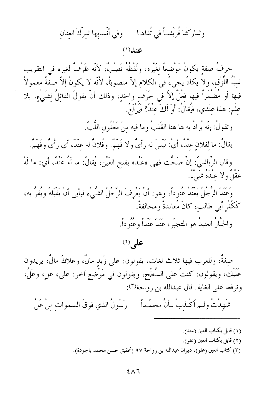 حرفُ صفةٍ يكونُ مَوْضِعاً لغَيْره، ولَفْظُهُ نَصْبٌ، لأنّه ظَرْفٌ لغيره في التقريب شِبْهُ اللَّزْقِ، ولا يكادُ يجيءُ في الكلام إلا منصوباً، لأنه لا يكونُ إلا صفةً معمولاً فيها أو مُضْمَراً فيها فِعْلٌ إلا في حَرْفٍ واحدٍ، وذلك أنْ يقول القائِلُ لِشَيْءٍ، بلا عِلْم: هذا عِنْدي، فيُقالُ: أوَلَكَ عِنْدٌ؟ فَيُرْفَعُ.