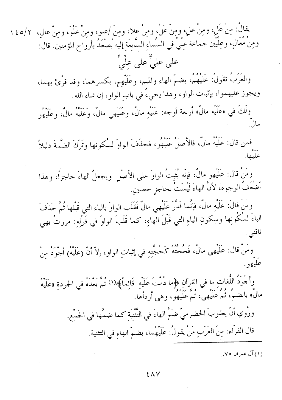 وأجْوَدُ اللُّغات ما في القرآن {مَا دُمْتَ عَلَيْهِ قَائِماً} ثُمَّ بَعْدَهُ في الجودةِ "عَلَيْهُ مالٌ" بالضمِّ، ثُمَّ عَلَيْهي، ثُمَّ عَلَيْهُو، وهي أردأها.