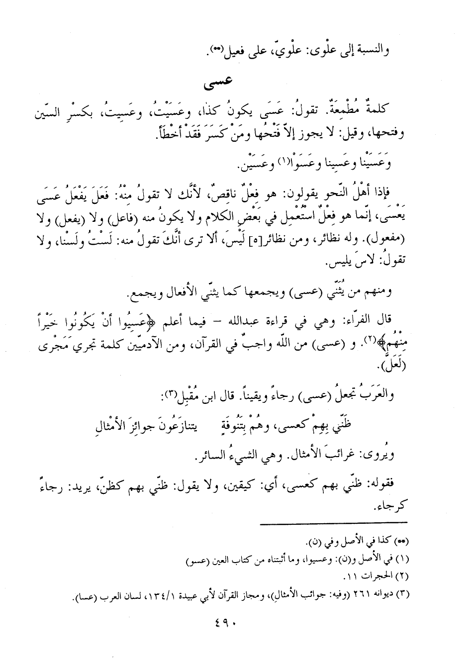 فإذا أهْلُ النّحو يقولون: هو فِعْلٌ ناقِصٌ، لأنَّك لا تقولُ مِنْهُ: فَعَلَ يَفْعَلُ عَسَى يَعْسَى، إنّما هو فِعْلٌ اسْتُعْمِل في بَعْضِ الكلام ولا يكونُ منه (فاعل) ولا (يفعل) ولا (مفعول). وله ظائر، ومن نظائر [هـ] لَيْسَ، ألا ترى أنَّكَ تقولُ منه: لَسْتُ ولَسْنا، ولا تقولُ: لاسَ يليس.