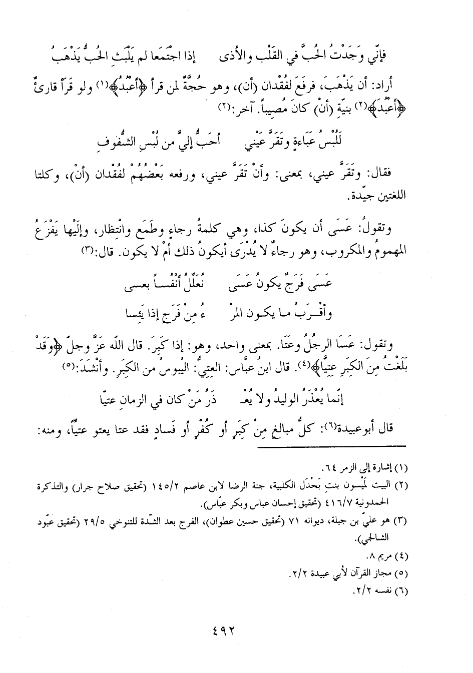 وتقول: عَسَا الرجُلُ وعَتَا. بمعنى واحد، وهو: إذا كَبِرَ. قال الله عز وجل {وَقَدْ بَلَغْتُ مِنْ الْكِبَرِ عِتِيّاً}. قال ابن عباس: العِتِيُّ: اليُبوسُ من الكِبَرِ. وأنشد: