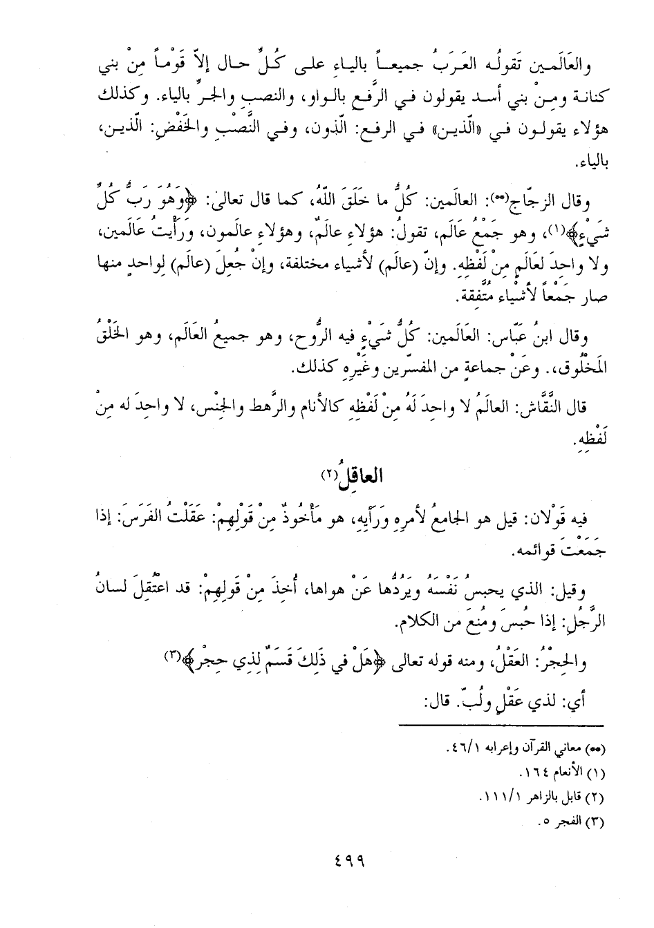 وقال الزجّاج: العالَمين: كُلُّ ما خَلَقَ اللهُ، كما قال تعالى: {وَهُوَ رَبُّ كُلِّ شَيْءٍ}، وهو جَمْعُ عَالَم، تقولُ: هؤلاءِ عالَمٌ، وهؤلاءِ عالَمون، ورأيتُ عَالَمين، ولا واحِدَ لعَالَمٍ مِنْ لَفْظِه. وإنّ (عالَم) لأشياء مختلفة، وإنْ جُعِلَ (عالَم) لِواحدٍ منها صار جمعاً لأشياء مُتَّفِقة.