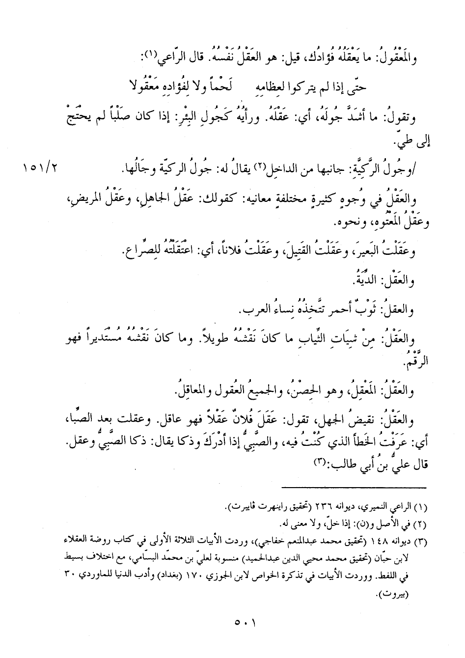 والعَقْلُ في وُجوهٍ كثيرةٍ مختلفةٍ معانيه: كقولك: عَقْلُ الجاهِلِ، وعَقْلُ المريضِ، وعَقْلُ المَعْتُوهِ، ونحوه.