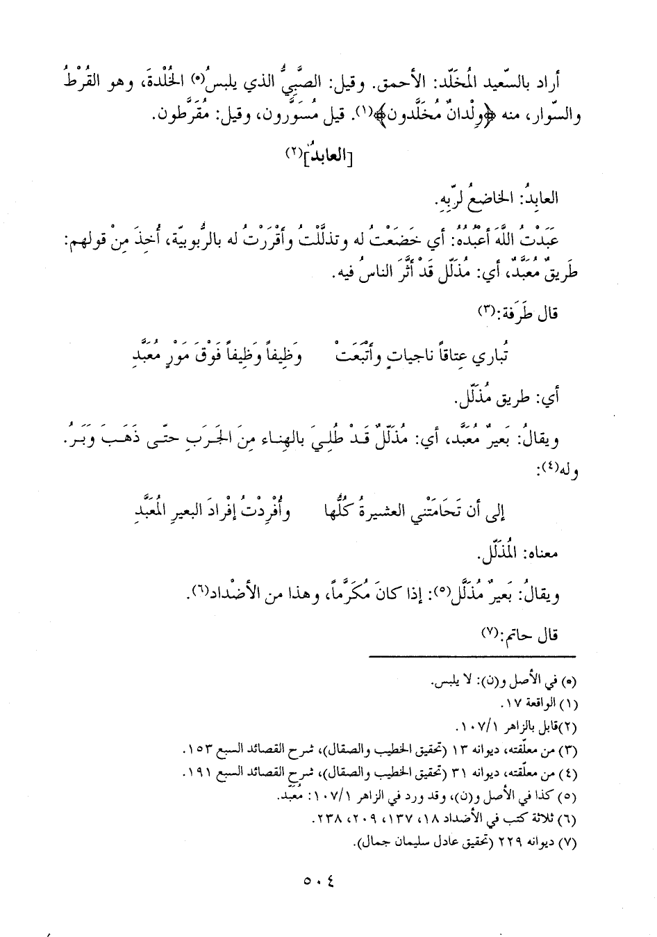 ويقالُ: بَعيرٌ مُعَبَّد، أي: مُذَلّلٌ قَدْ طُلِيَ بالهِناء مِنَ الجَرَبِ حتّى ذَهَبَ وَبَرُ. وله: