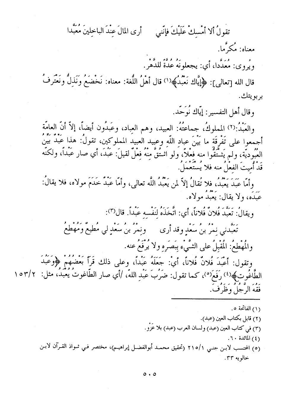 قال الله [تعالى]: {إِيَّاكَ نَعْبُدُ} قال أهلُ اللغة: معناه: نَخْضَعُ وَنَذِلُّ ونَعْتَرفُ بربويتك.
