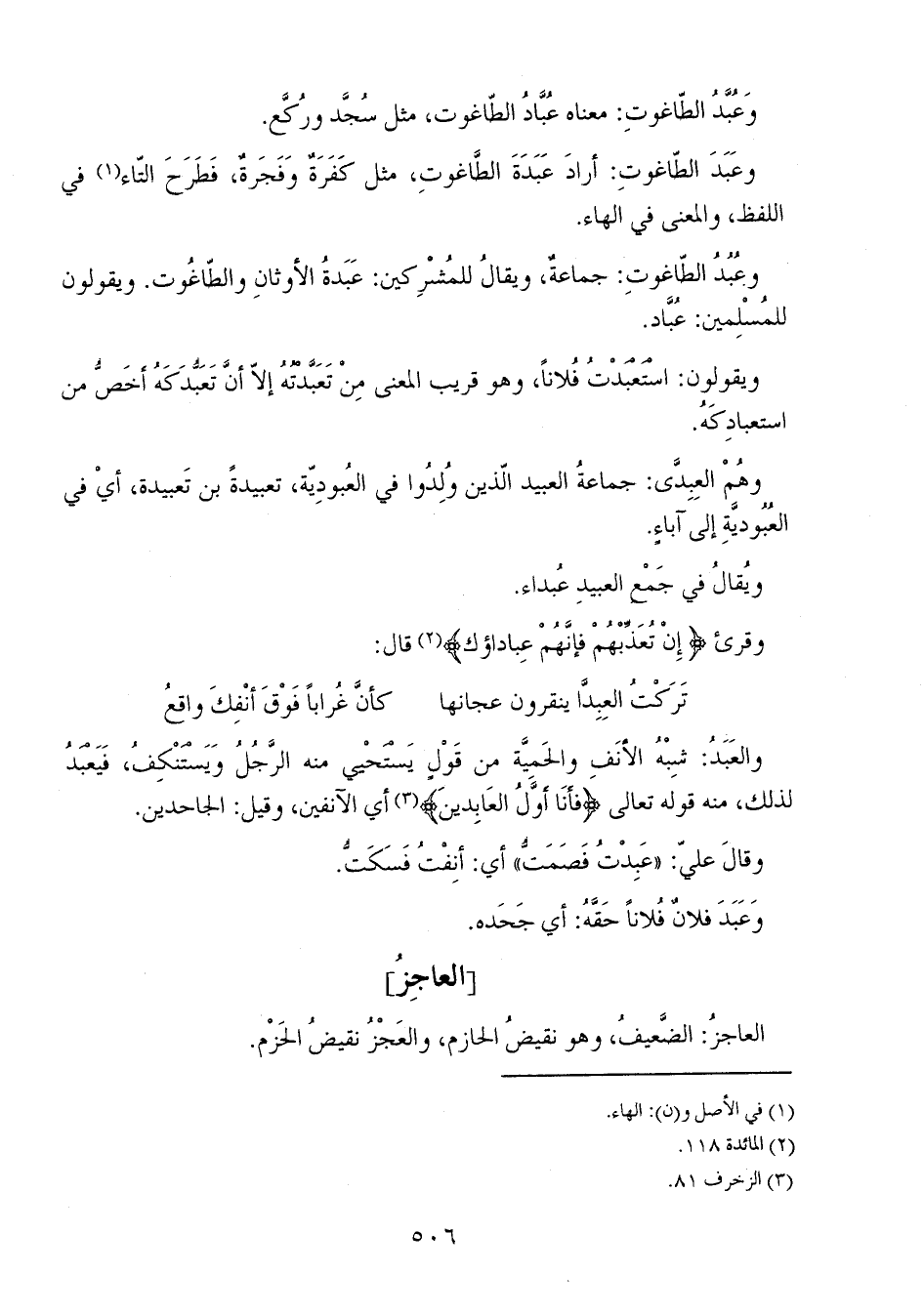 وعُبُدُ الطّاغوتِ: جماعةٌ، ويقالُ للمشركين: عَبَدةُ الأوثانِ والطّاغُوت. ويقولن للمُسْلِمين: عُبَّاد.