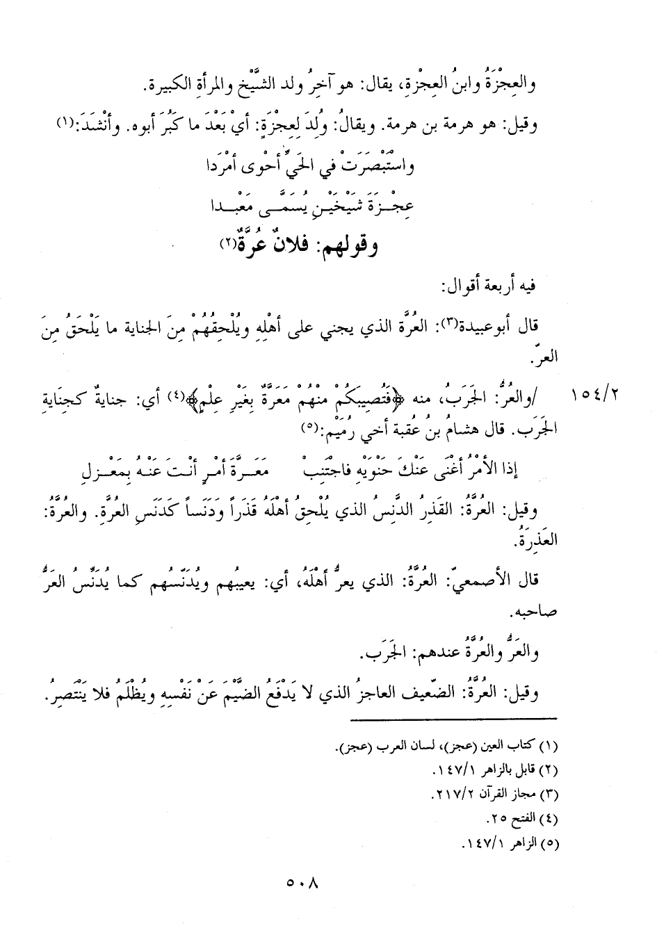 2/ 154 والعُرُّ: الجَرَبُ، منه {فَتُصِيبَكُمْ مِنْهُمْ مَعَرَّةٌ بِغَيْرِ عِلْمٍ} أي: جنايةٌ كجِنَايةِ الجَرَب. قال هشامُ بنُ عُقبة أخي رُمَيْم: