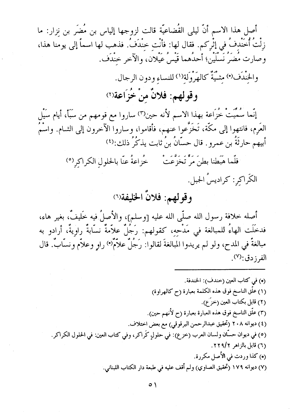 أصله خلافة رسول الله صلى الله عليه [وسلم]، والأصلُ فيه خليفٌ، بغير هاء، فدخلت الهاء للمبالغة في مدحه، كقولهم: رجلٌ علامةٌ نسابةٌ راويةٌ، أرادوا به مبالغة في المدح، ولو لم يريدوا المبالغة لقالوا: رجلٌ علامٌ راوٍ وعلام ونسابٌ. قال الفرزدق: