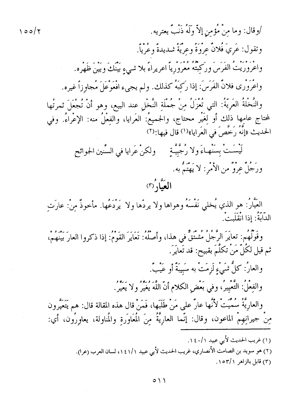 والعارِيَّةُ سُمِّيَتْ لأنَّها عارٌ على مَنْ طَلَبَها، فَمَنْ قال هذه المقالة قال: هم يَتَعَيَّرون مِنْ جيرانِهِمْ الماعون، وقال: إنّما العارِيَّةُ مِنَ المُعَاوَرةِ والمُناولة، يعاوِرُون، أي:
