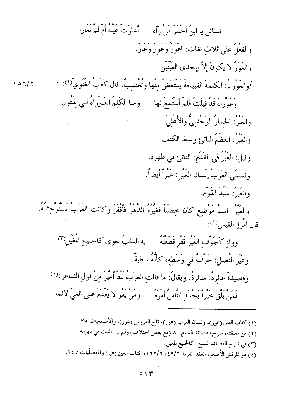 2/ 156 والعَوْراءُ: الكلمةُ القبيحةُ يُمْتَعَضُ مِنْها وتُغْضِبُ. قال كَعْبُ الغَنَوي!: