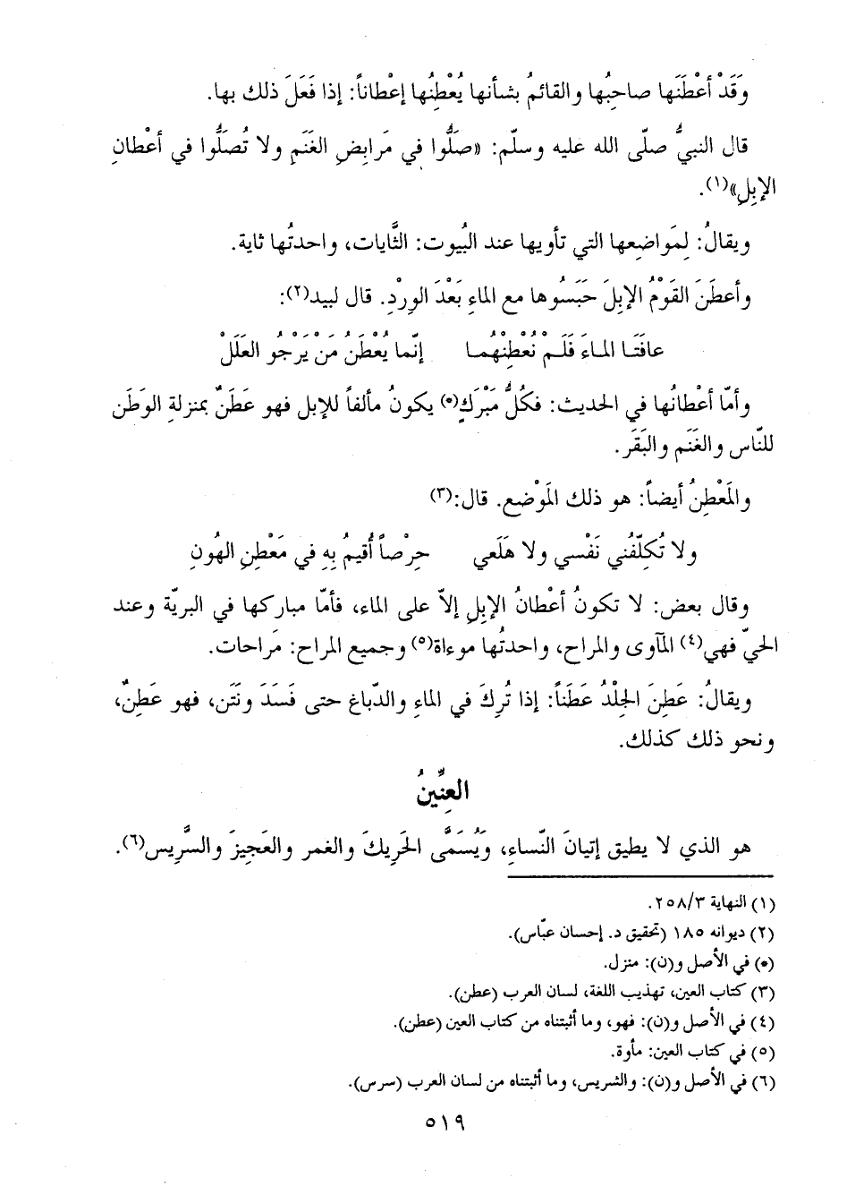 وأمّا أعْطانُها في الحديث: فكُلُّ مَبْرَكٍ يكونُ مألفاً للإبل فهو عَطَنٌ بمنزلةِ الوَطَن للنّاس والغَنَم والبَقَر.