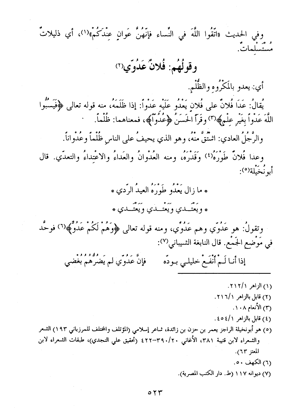 وتقولُ: هو عَدُوّي وهم عَدُوِّي، ومنه قوله تعالى {وَهُمْ لَكُمْ عَدُوٌّ} فوحَّد في مَوْضع الجَمْع. قال النابغة الشيباني: