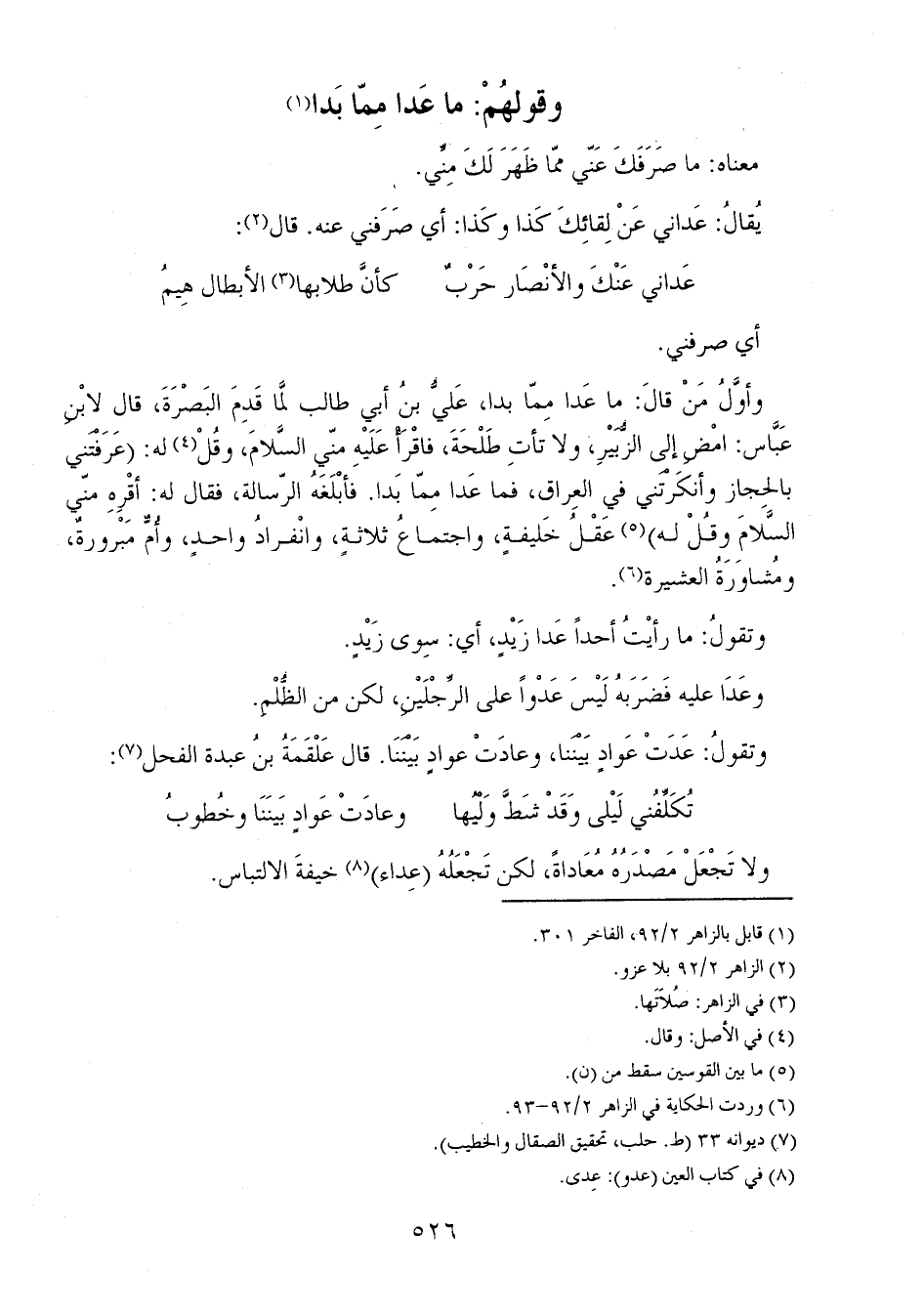 وتقولُ: ما رأيْتُ أحداً عَدا زَيْدٍ، أي: سِوى زَيْدٍ.