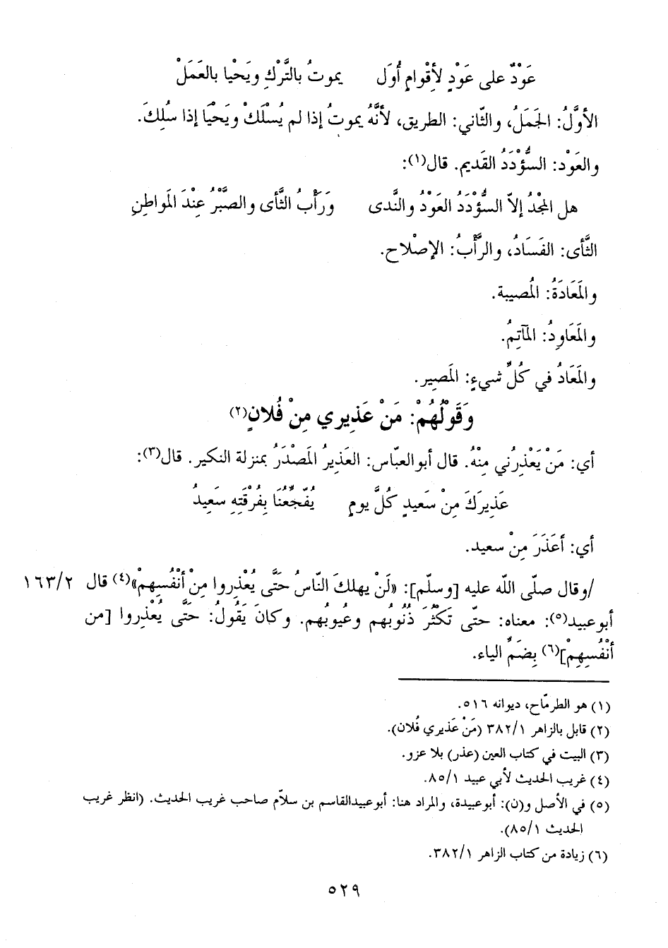 2/ 163 وقال صلى الله عليه [وسلم]: "لَنْ يهلكَ النّاسُ حَتَّى يُعْذِروا من أنْفُسِهمْ" قال أبو عبيد: معناه: حى تكْثُرَ ذُنُوبُهم وعُيوبُهم. وكانَ يَقُولُ: حَتَّى يُعْذِروا [من أنْفُسهمْ] بضَمِّ الياء.