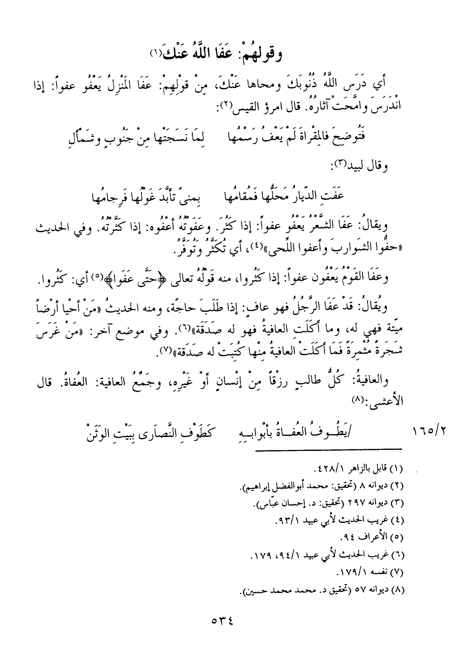 ويقال:" عَفَا الشَّعْرُ يَعْفُو عفواً: إذا كَثُرَ. وعَفَوْتُهُ أعْفُوه: إذا كَثَّرْتُهُ. وفي الحديث "حفُّوا الشواربَ وأعفوا اللُّحى"، أي تُكَثَّرُ وتُوَفَّرُ.