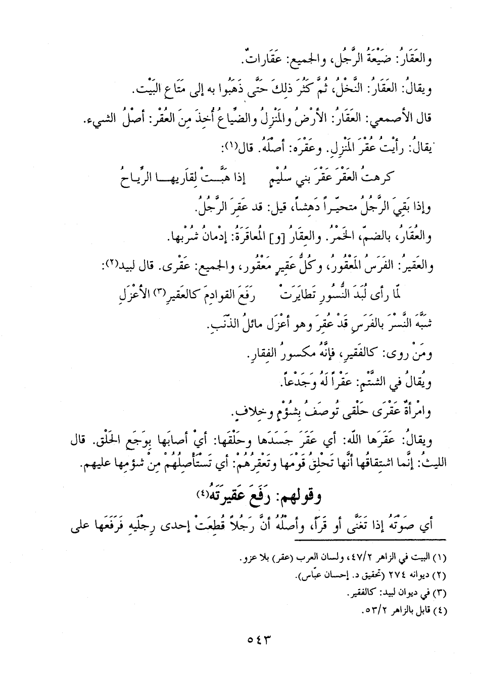 قال الأصمعي: العَقَارُ: الأرْضُ والمَنْزِلُ والضِّياعُ أُخِذَ مِنَ العُقْر: أصْلُ الشيء.