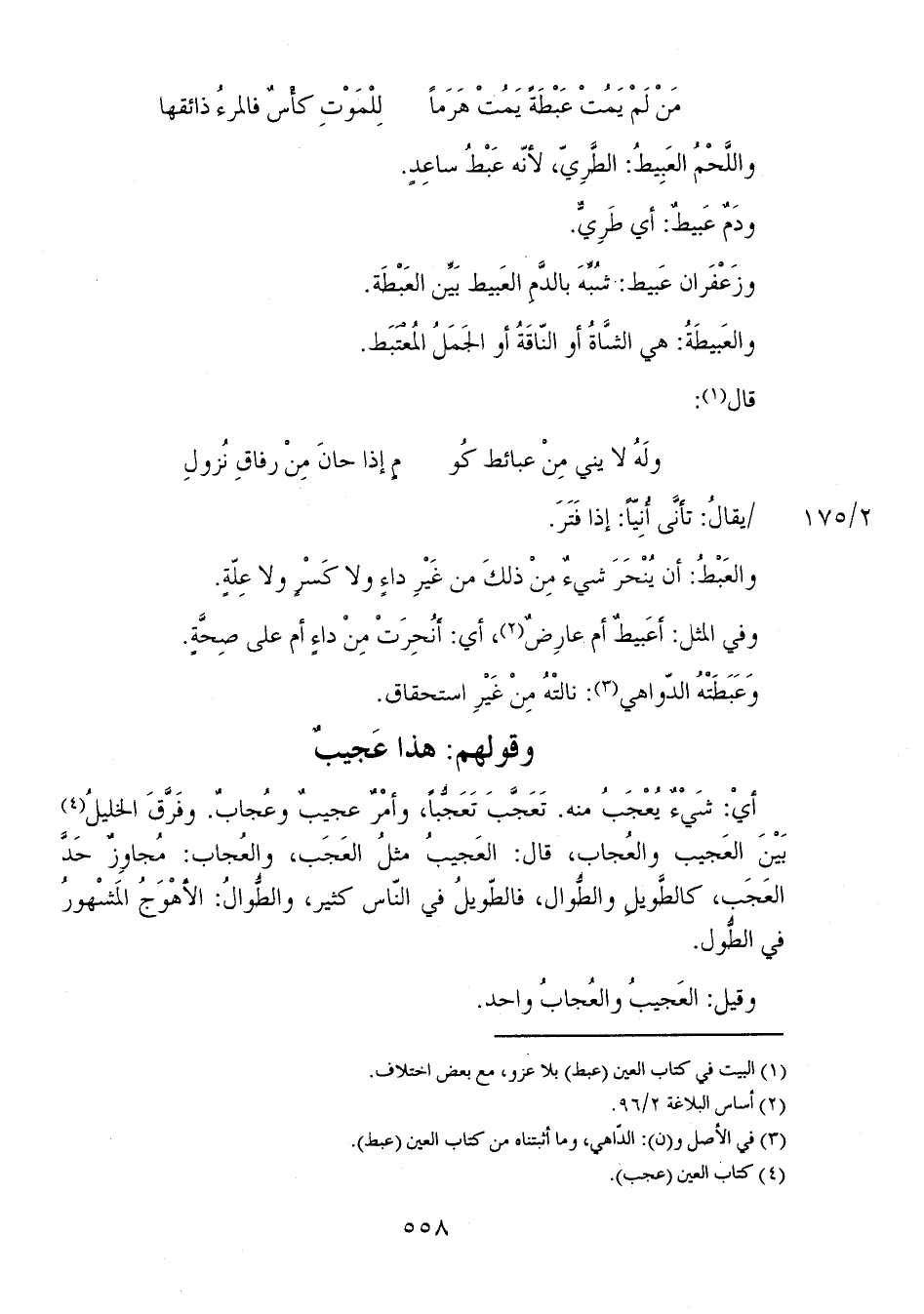 أيْ: شَيْءٌ يُعْجَبُ منه. تَعَجَّبَ تَعَجُّباً، وأمْرٌ عجيبٌ وعُجابٌ. وفَرَّقَ الخليلُ بَيْنَ العَجيب والعُجاب، قال: العَجيبُ مثلُ العَجَب، والعُجاب: مُجاوزٌ حَدٌّ العَجَب، كالطَّويلِ والطُّوال، فالطّويلُ في النّاس كثير، والطّثوالُ: الأهْوَجُ المَشْهورُ في الطُّول.