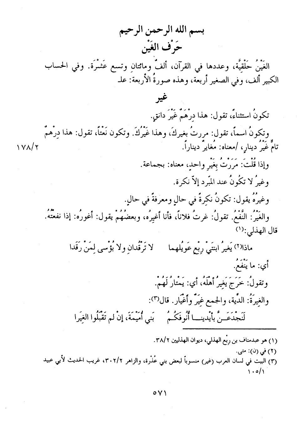 الغَيْنُ حَلْقِيَّة، وعددها في القرآن، ألفٌ ومائتانِ وتسع عَشْرَة. وفي الحساب الكبير ألأف، وفي الصغير أربعة، وهذه صورةُ الأربعة: علـ
