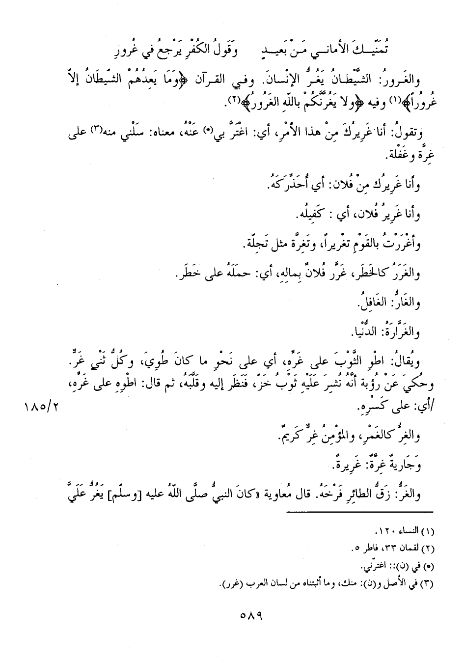 والغرورُ: الشَّيْطانُ يَغُرُّ الإنْسانَ. وفي القرآن {وَمَا يَعِدُهُمْ الشَّيْطَانُ إِلاَّ غُرُوراً} وفيه {وَلا يَغُرَّنَّكُمْ بِاللَّهِ الْغَرُورُ}.
