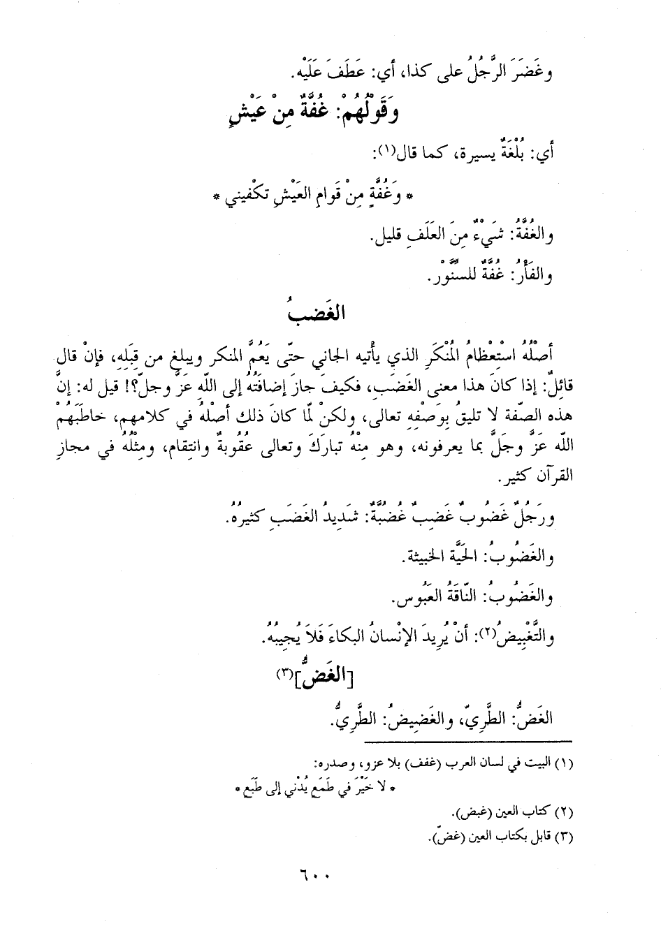 أصْلُهُ اسْتِعْظامُ المُنْكَرِ الذي يأتيه الجاني حتّى يَعُمَّ المنكر ويبلغ من قِبَلِهِ، فإنْ قال قائِلٌ: إذا كانَ هذا معنى الغَضَبِ، فكيفَ جازَ إضافَتُهُ إلى اللهِ عز وجل؟! قيل له: إنَّ هذه الصّفة لا تليقُ بِوَصْفِهِ تعالى، ولكنْ لّما كانَ ذلك أصْلهُ في كلامهم، خاطَبَهُمْ الله عز وجل بما يعرفونه، وهو مِنْهُ تبارَكَ وتعالى عُقُوبةٌ وانتِقام، ومِثْلُهُ في مجازِ القرآن كثير.