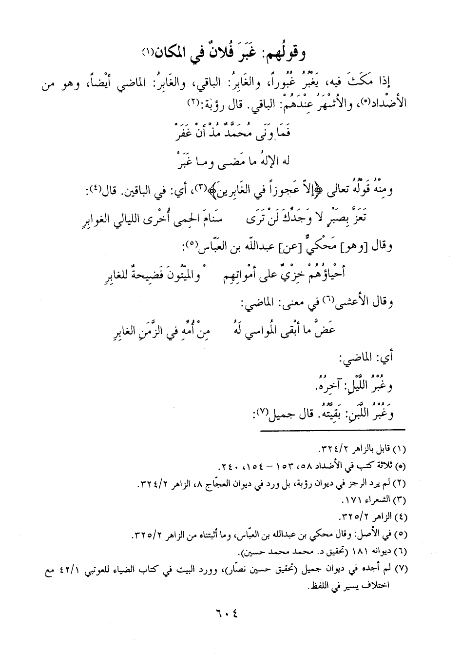 ومِنْهُ قَوْلُهُ تعالى {إِلاَّ عَجُوزاً فِي الْغَابِرِينَ}، أي: في الباقين. قال: