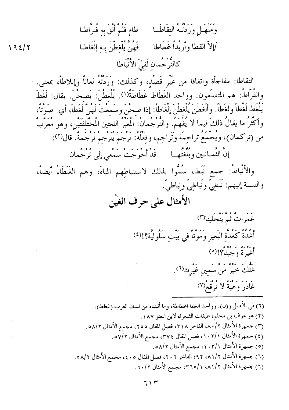 التقاطا: مفاجأة واتفاقا من غَيْرِ قَصْدٍ، وكذلك: وَرَدْتُهُ لعاناً وإبلاطاً، بمعنى. والفُرّاطُ: هم المتقدّمون. وواحد الغَطَاط غَطَاطَةٌ. يُلْغِطْنَ: يَصِحْنَ. يقال: لَغَطَ يَلْغَط لَغْطاً ولَغَطَاً. وألْغَطْنَ يُلْغِطْنَ إلْغَاطاً: إذا صِحْنَ وسَمِعْتَ لَهُنَّ لَغَطاً، أي: صَوْتاً، وأكْثَرُ ما يقالُ ذلكَ فيما لا يُفْهَمُ. والتُّرْجُمانُ: المُعَبِّرُ اللغتين المُخْتَلِفَتَيْنِ، وهو مُعَرَّبٌ من (تركمان)، ويُجْمَعُ تراجِمَة وتَراجِم، وفِعْلُهُ: تَرْجَمَ يُتَرْجِمُ تَرْجَمةٌ. قال: