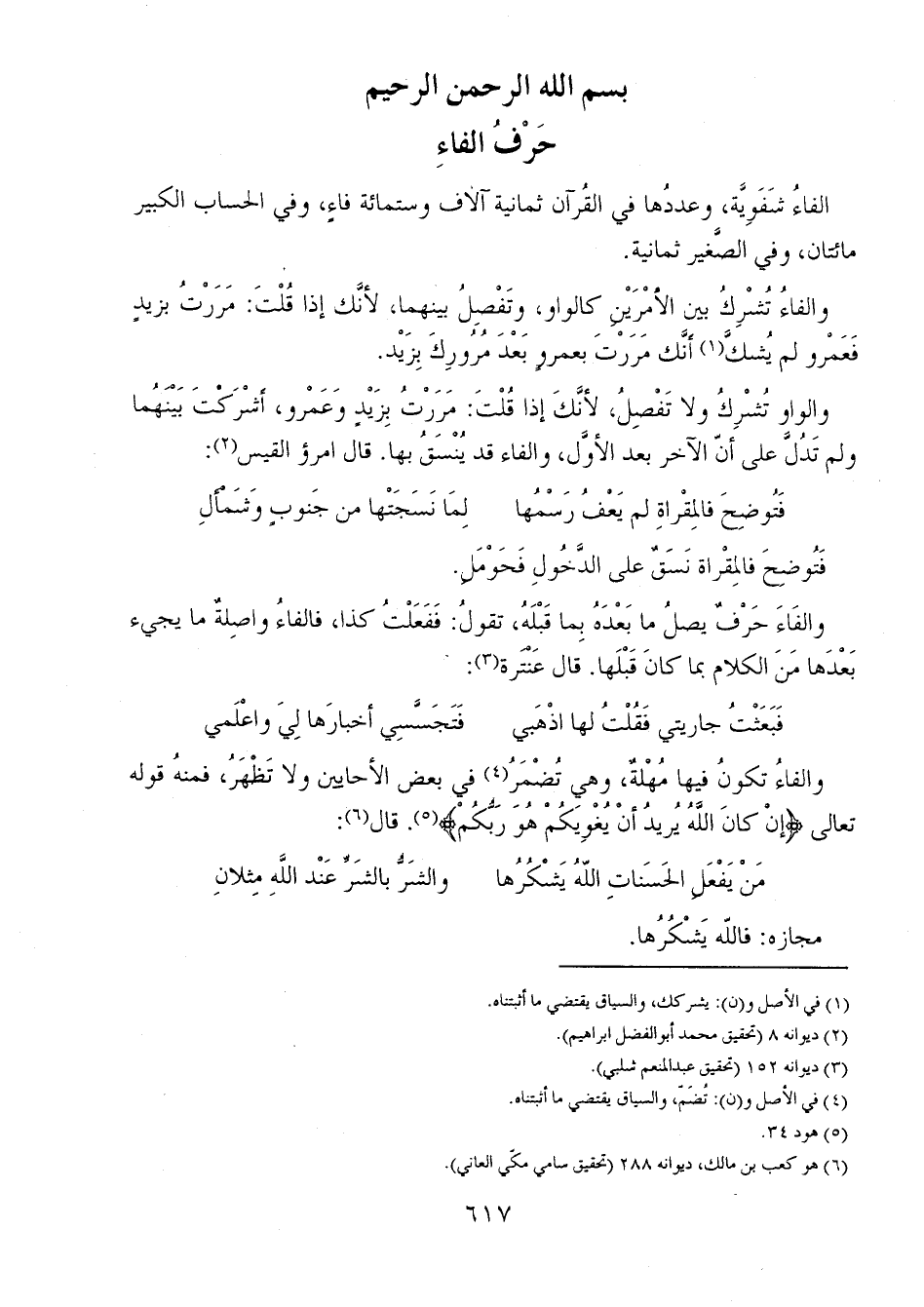 والفاءُ تُشْرِكُ بين الأمْرَيْنِ كالواو، وتَفْصِلُ بينهما، لأنَّك إذا قُلْتَ: مَرَرْتُ بزيدٍ فَعَمْرو لم يُشكَّ أنَّك مَرَرْتَ بعمروٍ بَعْدَ مُرُورِكَ بِزَيْد.