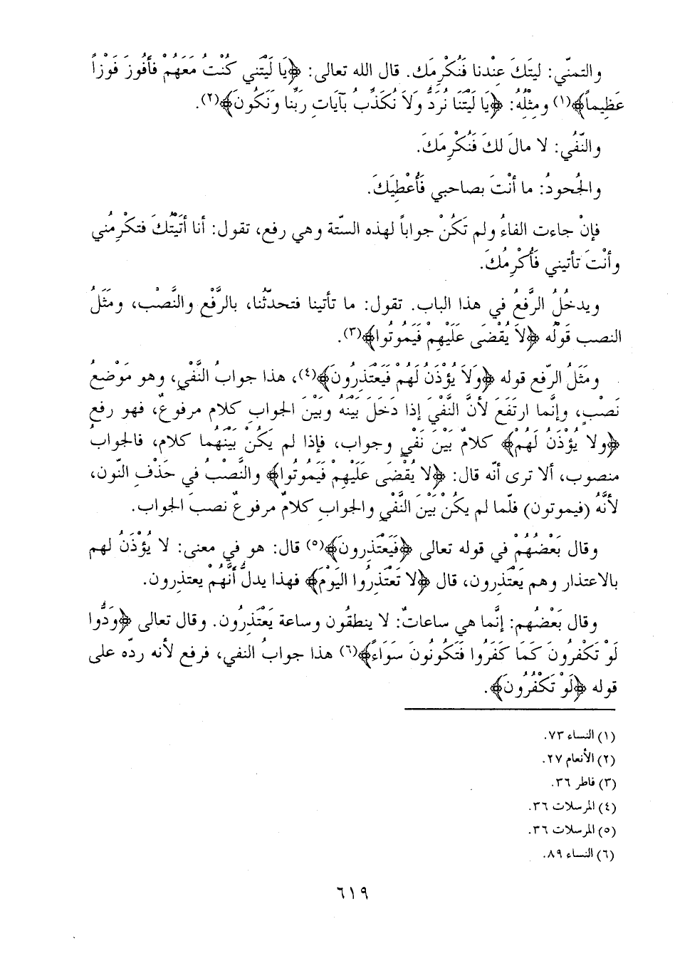 ويدخُلُ الرَّفعُ في هذا الباب. تقول: ما تأتينا فتحدّثُنا، بالرَّفْع والنَّصْب، ومَثَلُ النصب قَوْلُه {لا يُقْضَى عَلَيْهِمْ فَيَمُوتُوا}.