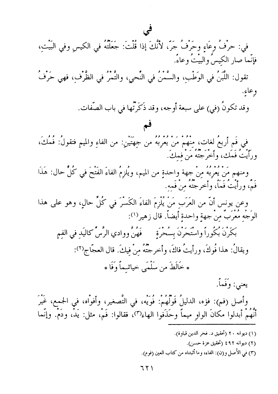 في فَمِ أربعُ لغات، مِنْهُمْ مَنْ يُعْرِبُهُ من جِهَتَيْنِ: من الفاءِ والميمِ فتقولُ: فُمُكَ، ورَأيْتُ فَمَك، وأخْرَجْتُهُ مَنْ فِمِكَ.
