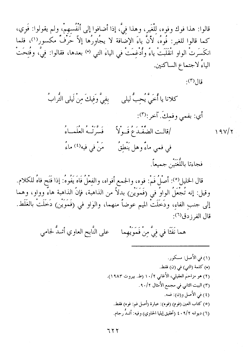 قالوا: هذا فوك وفوه، لِلْغَير، وهذا فِيَّ، إذا أضافوا إلى أنْفُسِهِمْ، ولم يقولوا: فَوي، كما قالوا للغير: فُوهُ، لأنَّ ياءَ الإضافة لا يجُاوِرُها إلا حَرْفٌ مكسور، فلما انكَسَرتْ الواو انْقَلَبَتْ ياءً وأُدْغِمَتْ في الياء التي بعدها، فقالوا: فِيَّ، وفُتِحَتْ الياءُ لاجتماع الساكنين.