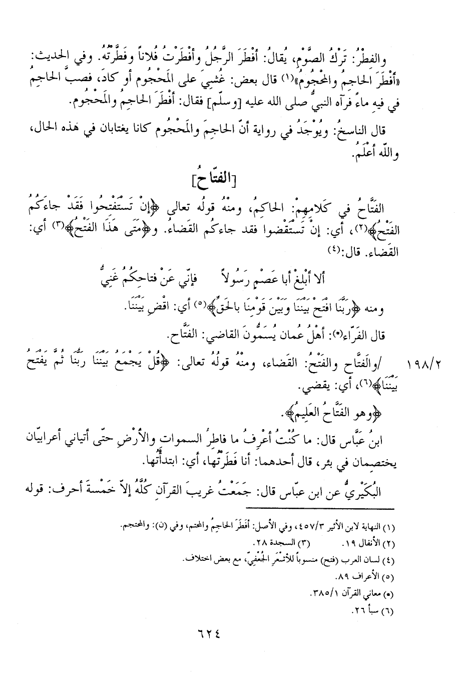 2/ 198 والفَتَّاح والفَتْحُ: القَضاء، ومنهُ قوله تعالى: {قُلْ يَجْمَعُ بَيْنَنَا رَبُّنَا ثُمَّ يَفْتَحُ بَيْنَنَا}، أي: يقضي.